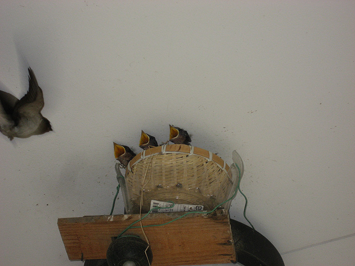 その後、残っていた3羽が巣ごと落ちてしまい、代わりにザルに入れといた。