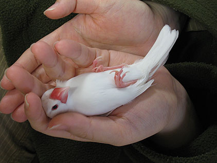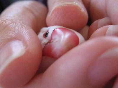 自力でエサの殻が割れないほどで、粟玉や栄養剤、玉子の黄身、果物など、とにかく柔らかくて栄養のあるものを食べさせ、ひよこ電球で保温。
