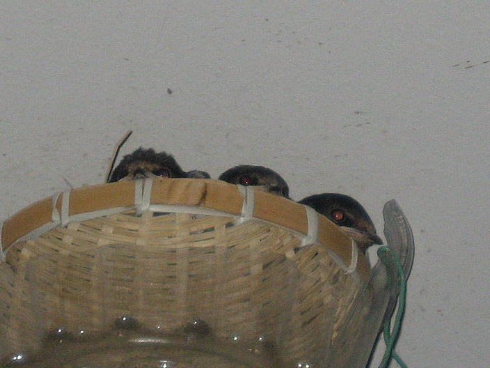 その後、残っていた3羽が巣ごと落ちてしまい、代わりにザルに入れといた。
